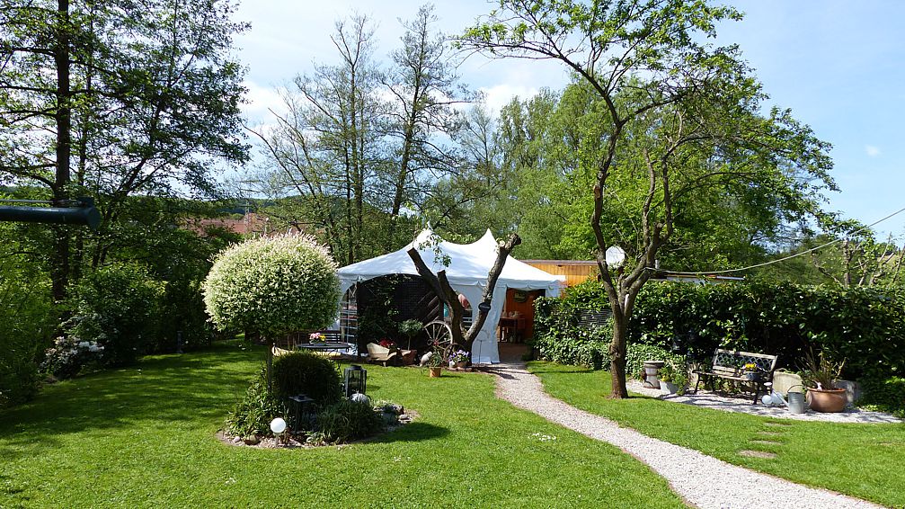 mit Pavillon und umfangreichen Gartenmöbeln