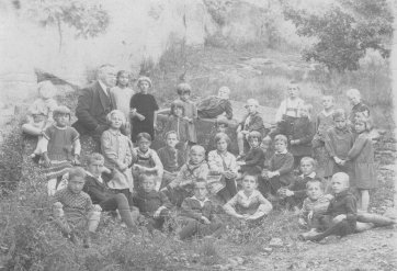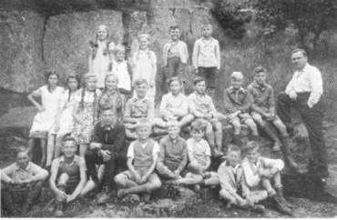 Lehrer Collmar mit seinen Schülerinnen u. Schülern 1930 unterhalb des Wacholderberges neben der Neunkirchner Straße
