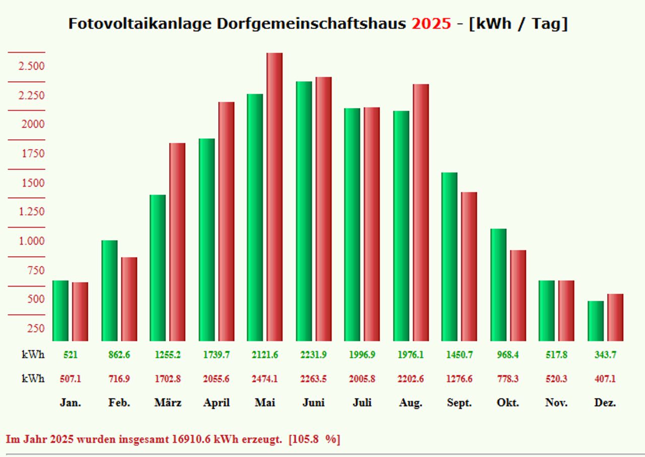 Die Anlage liefert fast 15 Jahre nach der Errichtung noch immer ihren Soll-Ertrag Seit 2018 hat sich die Anlage amortisiert und erwirtschaftet ca. 3.500 €/Jahr. Weitere Informationen finden Sie unter Gemeinde → Bürgerhaus → Fotovoltaik. |
