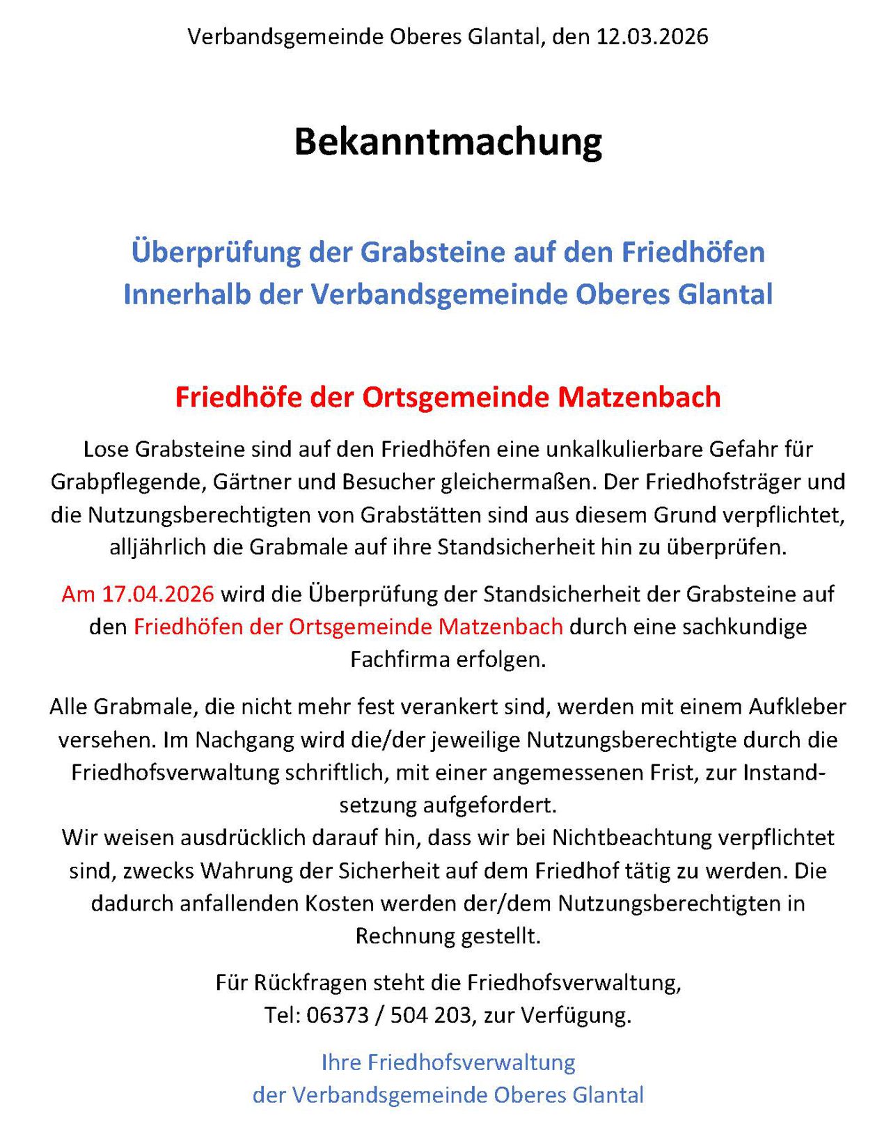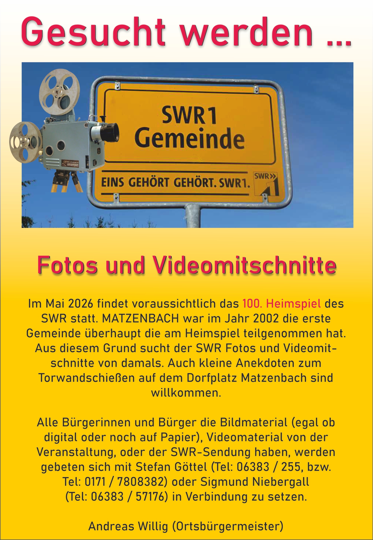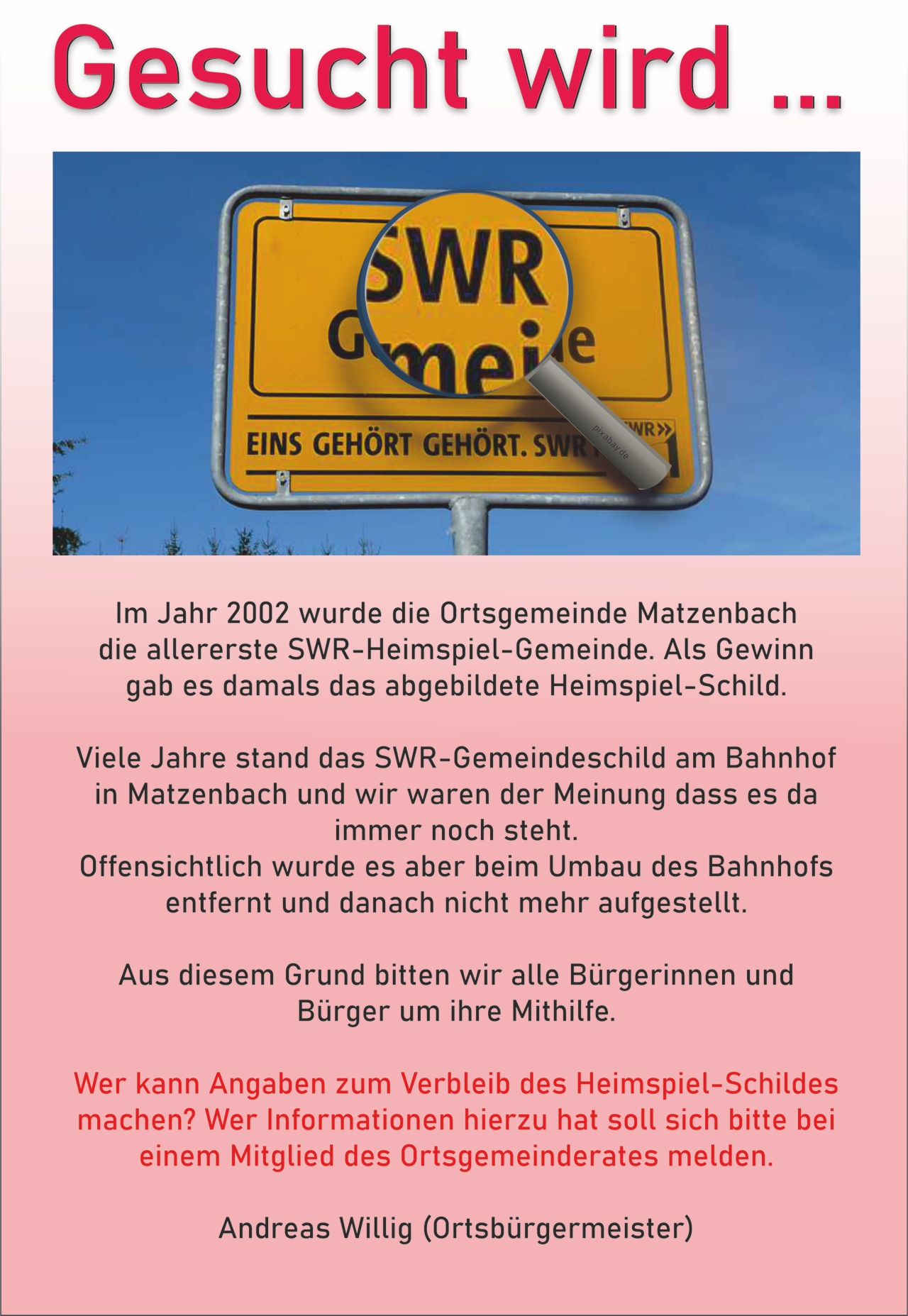 der Gemeinde Matzenbach, vertreten durch den Ortsbürgermeister Andreas Willig.