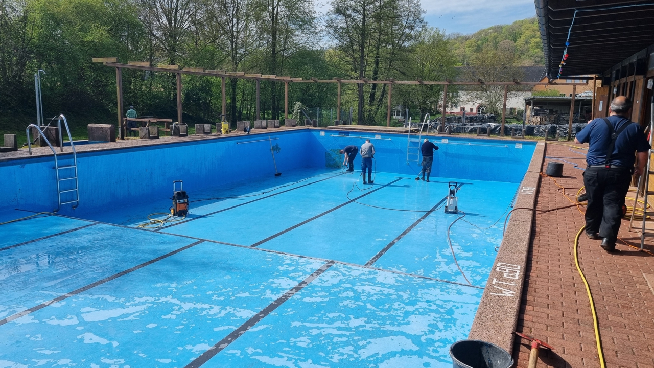 2026 - Reinigung des Solarfreibades Am Samstag den 18.04. fand die Grobreinigung des Solarfreibades statt. ![]() Nach dem Ablassen des Wassers sah das Becken schon extrem verschmutzt aus. ![]() Über Winter sammelt sich da schon einiges an Schmutz und Getier (wurde natürlich wieder ausgesetzt) an. ![]() Mit drei Hochdruckreinigern wurde dann die Beckenumrandung ... ![]() ... die Wände und der Boden gründlich gereinigt. ![]() Nach gut drei Stunden sah das Becken schon richtig gut aus ... ![]() ... und eine halbe Stunde später war alles sauber. ![]() Nach getaner Arbeit gab es noch ein leckeres Mittagessen (besten Dank an die Köchin Sonja, die das leckere Essen zubereitet hatte) für alle. Hier im Bild nur ein Teil der HelferInnen. ![]() Nach diesem tollen Essen wurde als Zugabe auch noch das Mühlefeld gereinigt. ![]() So sieht es schon deutlich besser aus. Wenn die Markierungen im Becken angebracht werden wird auch hier nochmals nachgestrichen. Leider konnten wir kein HelferInnen-Foto aufnehmen, trotzdem besten Dank an Andreas, Herbert, Isolde, Jürgen, Kurt, Lukas, Matthias, Sigi und Sonja.